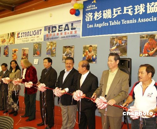 當(dāng)?shù)貢r(shí)間6月14日,已有11年歷史的美國(guó)洛杉磯乒乓球協(xié)會(huì)新場(chǎng)館落成,洛杉磯乒乓球協(xié)會(huì)會(huì)長(zhǎng)劉旭按、前會(huì)長(zhǎng)呂詩(shī)澄等參加新場(chǎng)館剪彩開(kāi)幕典禮。該協(xié)會(huì)以培養(yǎng)華人乒乓球選手為宗旨,約有150名乒乓好手輪番參加訓(xùn)練,并訓(xùn)練出高軍、趙越、彭藹秋、黃堯晰4人代表美國(guó)乒乓球隊(duì)參加北京奧運(yùn)會(huì)。中新社發(fā) 盧威 攝
