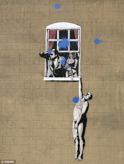 被彩蛋射擊污損的壁畫創(chuàng)作于2006年,描述的是一個(gè)赤裸裸的男人單手吊在房屋的窗口外,而他情婦的丈夫在屋內(nèi)尋找他。這幅壁畫現(xiàn)在已被人用6發(fā)藍(lán)色彩槍弄臟。