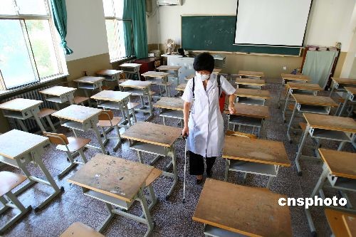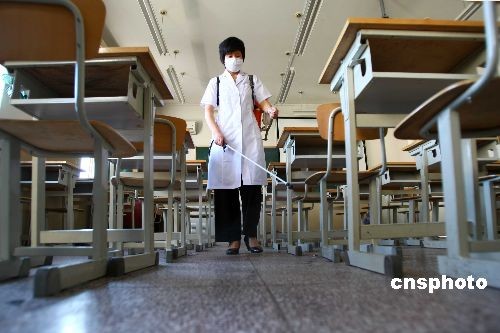 6月22日周一,北京市海淀區(qū)二里溝中心小學(xué)的老師在同學(xué)到來之前為校室進(jìn)行全面的消毒,嚴(yán)防甲型H1N1。近日,針對甲型H1N1流感警戒級別升至6級,北京市衛(wèi)生局、教委聯(lián)合印發(fā)《北京市學(xué)校傳染病防控工作管理指導(dǎo)意見》,北京市各學(xué)校須每周至少對教室、走廊等處所消毒一次,在特殊時(shí)期要每日消毒。中新社發(fā) 富田 攝