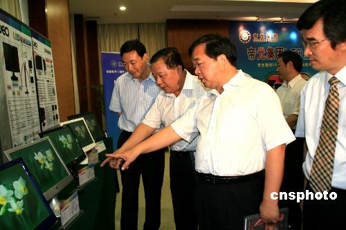 7月20日上午,揚州舉行由某集團自主研發(fā)的LED顯示終端系列產(chǎn)品發(fā)布會并現(xiàn)場進行展示,凸顯LED終端顯示應(yīng)用產(chǎn)品在健康、節(jié)能、環(huán)保和超薄、時尚等方面超前的理念。揚州市委書記季建業(yè)、市長王燕文等出席。季建業(yè)(右二)表示,揚州要著力推動綠色新能源產(chǎn)業(yè)的技術(shù)向高端突破,產(chǎn)品向終端延伸,推出“五個一”計劃,即1000萬臺LED顯示器、1000萬臺LED電視機、1000萬臺一體化筆記本電腦、1億盞LED燈、1億本E-book。到2012年,新能源、新光源產(chǎn)業(yè)實現(xiàn)產(chǎn)值“雙千億”。中新社發(fā) 崔佳明 攝