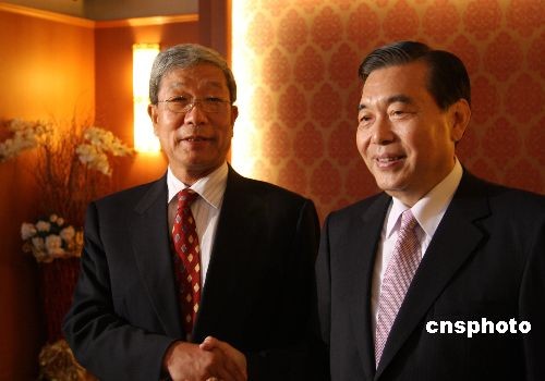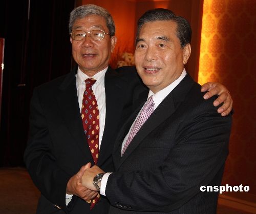 大陸海峽兩岸經(jīng)貿(mào)交流協(xié)會(huì)會(huì)長李水林率領(lǐng)“兩岸經(jīng)貿(mào)促進(jìn)考察團(tuán)”到臺(tái)灣進(jìn)行采購。圖為6月1日,李水林(左)與臺(tái)灣外貿(mào)協(xié)會(huì)董事長王志剛(右)共同接受采訪。李水林說:“我們是多年的好朋友、好兄弟。我長兩歲,稱大哥,志剛小兩歲,稱老弟。我們喝酒,志剛要先喝兩杯!敝行律绨l(fā) 耿軍 攝