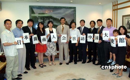 中國駐日大使館許澤友參贊兼總領(lǐng)事,7月2日下午在大使館會見了日本湖南之友會共同代表、日本湖南人會會長段躍中一行,并和日本湖南人會的副會長、理事們進行了一個小時的座談。許澤友說,湖南有很深的文化底蘊,又有豐富的資源,發(fā)展?jié)摿艽蟆F诖谌蘸先藶榇龠M家鄉(xiāng)、祖國與日本的交流方面起橋梁和窗口的作用。圖為日本湖南人會理事和許澤友總領(lǐng)事(左六)、劉敬師領(lǐng)事(右四)合影。中新社發(fā) 段躍中 攝