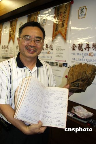 7月3日,臺(tái)灣棒球協(xié)會(huì)等單位在臺(tái)北舉行記者會(huì),宣布將于4日起舉行棒球紀(jì)念展,再現(xiàn)40年前金龍少棒隊(duì)獲得世界少棒冠軍的傳奇。圖為主辦單位展示“文物”級(jí)棒球手套及一位名教頭的棒球指導(dǎo)筆記。1969年,金龍少棒隊(duì)載譽(yù)歸來,臺(tái)北市鞭炮齊鳴,數(shù)十萬人走上街頭,盛極一時(shí),亦成為臺(tái)灣民眾至今津津樂道的共同記憶。中新社發(fā) 董會(huì)峰 攝