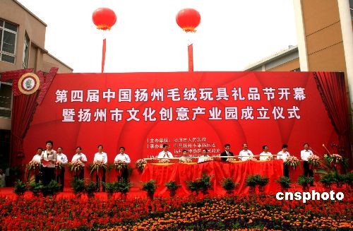 5月18日上午,“第四屆中國揚(yáng)州毛絨玩具禮品節(jié)在五亭龍國際玩具禮品城開幕,舉行揚(yáng)州市文化創(chuàng)意產(chǎn)業(yè)園成立、揚(yáng)州市五亭龍國際玩具精品館開館儀式,同時啟動揚(yáng)州市文化創(chuàng)意產(chǎn)業(yè)聯(lián)盟。中國禮儀用品工業(yè)協(xié)會副理事長、秘書長曾會師,揚(yáng)州副市長王玉新,維揚(yáng)區(qū)委書記姚蘇華等領(lǐng)導(dǎo)和來自海內(nèi)外數(shù)百名玩具采購商參加,開幕式由維揚(yáng)區(qū)長楊蓉主持。中新社發(fā) 崔佳明 攝