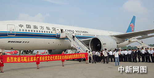 5月21日上午,廣西壯族自治區(qū)主席馬飚率領廣西經(jīng)貿(mào)文化代表團乘坐包機從廣西南寧機場起飛,開始飛赴臺灣,廣西由此成為中國大陸各省、自治區(qū)、直轄市中第一個由省長級官員率團赴臺進行經(jīng)貿(mào)文化交流的省份,此行也成為海峽兩岸交流史上的新突破。 馬飚率團此行赴臺是參加“兩岸產(chǎn)業(yè)高峰會議——2009年桂臺經(jīng)貿(mào)合作論壇”,廣西經(jīng)貿(mào)文化代表團人數(shù)多達1000余人,這也是大陸赴臺人數(shù)最多的參訪團。劉萬強 攝