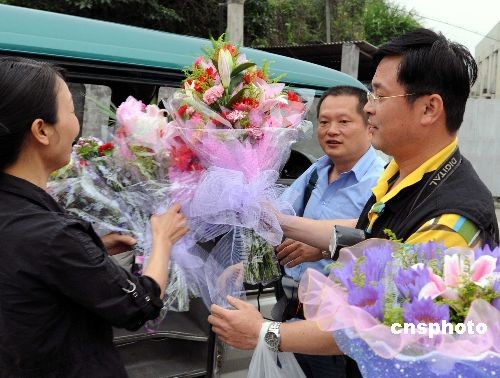 5月27日傍晚,在福州定點場所解除醫(yī)學觀察后,兩名福建省首例輸入性甲型H1N1流感確診患兒同機接觸者接受親友(左一)贈送的鮮花。當日,福建省衛(wèi)生廳在其網(wǎng)站上發(fā)布福建省甲型H1N1流感防控信息通報,截止5月26日24:00,衛(wèi)生部通報福建省首例輸入性甲型H1N1流感確診患兒病情進一步好轉(zhuǎn),無咳嗽及流涕,無并發(fā)癥,精神狀態(tài)良好,體溫正常,已連續(xù)3天體溫低于37℃。根據(jù)專家組的意見,該患兒同機的30名在閩密切接觸者隔離醫(yī)學觀察期限為5月27日20時。屆時密切接觸者如無特殊情況,即按期解除醫(yī)學觀察。患兒親屬及就診過程中的8名密切接觸者將按其與患兒脫離接觸的時間起算,隔離滿7日后,陸續(xù)解除醫(yī)學觀察。中新社發(fā) 劉可耕 攝
