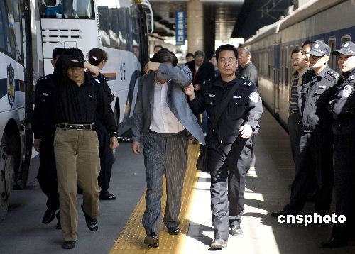 廣西南寧一名人稱傳銷業(yè)“教授”的何姓老漢,因組織在南寧市從事傳銷的140多名外省籍傳銷人員到北京參加所謂的“第二屆群英會暨振興民族經(jīng)濟(jì)杰出華人高峰論壇”,被南寧警方抓獲。日前,“何教授”等4名主要犯罪嫌疑人已被南寧市青秀區(qū)人民檢察院以組織、領(lǐng)導(dǎo)非法傳銷罪批準(zhǔn)逮捕。圖為南寧市經(jīng)濟(jì)犯罪偵查支隊民警將“何教授”等人從京押解回南寧。中新社發(fā) 韋強(qiáng) 攝