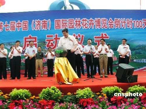 第七屆中國(guó)(濟(jì)南)國(guó)際園林花卉博覽會(huì)六月十四日在舉辦地山東省城濟(jì)南舉行了倒計(jì)時(shí)一百天啟動(dòng)活動(dòng)。第七屆中國(guó)(濟(jì)南)國(guó)際園林花卉博覽會(huì)是中國(guó)園林花卉界最高層次的盛會(huì),每?jī)赡昱e辦一屆。是屆園博會(huì)將于二00九年九月二十二日至二0一0年五月在濟(jì)南舉行。圖為濟(jì)南市市長(zhǎng)張建國(guó)啟動(dòng)第七屆中國(guó)(濟(jì)南)國(guó)際園林花卉博覽會(huì)一百天倒計(jì)時(shí)牌。中新社發(fā) 張譯文 攝