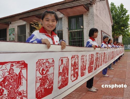 6月17日,在山東博興縣興福鎮(zhèn)村魏小學(xué),歷經(jīng)近兩個(gè)月的時(shí)間,由該?碳埮d趣小組小學(xué)生集體制作的刻紙作品《水滸一百單八將》全部刻制完成。這幅作品全長(zhǎng)38米,寬0.6米,容納進(jìn)了宋江、林沖、魯智深等梁山好漢108人刻紙像。作品以剪紙與刀工技藝結(jié)合手法,形象表現(xiàn)了我國(guó)古代四大名著《水滸傳》中108位“梁山好漢”的個(gè)性。中新社發(fā) 陳彬 攝