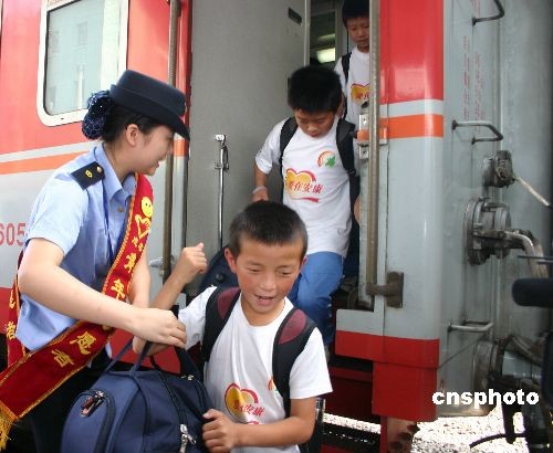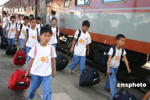 6月20日16時25分,由鐵道部特批的“日照-成都”愛心專列安全駛?cè)氤啥寄险尽?22名在山東日照“安康家園”學(xué)習(xí)生活的地震災(zāi)區(qū)孩子,在離開四川家鄉(xiāng)一年后,重新踏上家鄉(xiāng)的土地,即將開啟他們新的生活。去年6月,在全國婦聯(lián)、中國兒童少年基金會的安排下,來自四川省10個市、州的共720名災(zāi)區(qū)娃娃,分22批陸續(xù)安排到山東日照市生活、學(xué)習(xí)。其中有522四川地震災(zāi)區(qū)的娃娃(其中338名地震孤兒)前往山東日照市“安康家園”學(xué)習(xí)生活,日照鋼鐵集團拿出192套新建職工住房建起“日照安康家園”,配備了120多位專職“安康媽媽”,同時建起食堂、醫(yī)務(wù)室、電子閱覽室等,創(chuàng)造了全國災(zāi)區(qū)娃娃安置中最大的“家”。中新社發(fā) 霍潺 攝