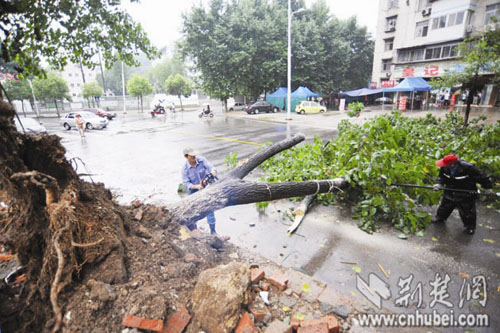 記者看到,在環(huán)山路東西湖區(qū)人民醫(yī)院附近的一個拆遷區(qū),這棵茂盛的梧桐樹根部拔起,歪倒于馬路上,將整條道路截?cái)唷硗囕v調(diào)頭繞行。在事發(fā)地對面餐館工作的王先生介紹,29日中午11時(shí)35分,正在下大雨,這棵十余米高的梧桐樹根部松動,繼而“轟”的一聲倒地。當(dāng)時(shí),兩名打著雨傘的女青年正好路過,梧桐樹的樹枝將她們的傘壓彎,兩人雖無礙,但也嚇得花容失色。