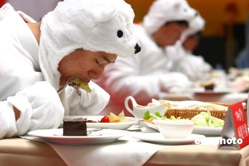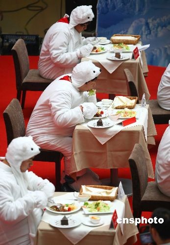 7月4日,一項(xiàng)關(guān)注全球變暖的時(shí)尚環(huán)保比賽在北京一購物中心舉行,比賽者身披厚厚的毛皮、頭戴北極熊頭套,在千瓦鎢絲燈光的烤射下,比賽吃西式牛排套餐;顒(dòng)旨在倡導(dǎo)都市潮人們在享受時(shí)尚浪漫生活的同時(shí),不忘“環(huán)保、減碳、愛地球”,關(guān)注“地球均溫如升高6度,冰川融化,不只北極熊將失去家園,地球也將面臨毀滅”的現(xiàn)實(shí)話題。中新社發(fā) 富田 攝