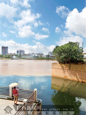7月8日,隨著南寧市今年第一次洪峰的逐漸消退,市民發(fā)現(xiàn)邕江竟然出現(xiàn)了黃色和黑色非常分明的“鴛鴦江”景象