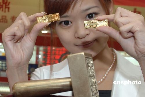 7月13日,國(guó)博版“建國(guó)60周年紀(jì)念金條”在北京宣布上市。圖為工作人員展示該套金條。產(chǎn)品每套含兩根25克Au9999金條,第一根金條主圖案選用了著名女?dāng)z影家候波1949年拍攝、現(xiàn)存唯一的《開國(guó)大典》正面原景歷史照片,記錄了毛澤東向世界宣告新中國(guó)成立的經(jīng)典瞬間。第二根金條主圖案選用了北京市民曹連弟2009年拍攝的《天安門》照片,從普通市民視角反映了舉國(guó)同慶的歷史場(chǎng)景。中新社發(fā) 鄒憲 攝