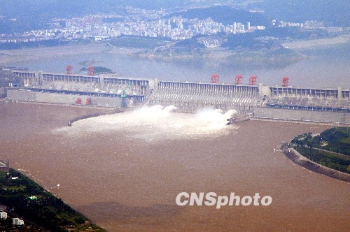 2009年7月20日,三峽大壩開啟4個泄洪深孔和一個排漂孔泄洪,場景宏偉壯觀。據(jù)中國長江三峽工程開發(fā)總公司消息,連日來,四川、重慶等長江上游地區(qū)普降大到暴雨,三峽入庫最大流量達(dá)3.4萬立方米/秒,由此形成的長江上游第三次洪峰目前正在安然通過三峽大壩。為迎接更大的洪汛,已按長江防汛抗旱總指揮部發(fā)布的2009年1號令,將三峽壩上水位均勻下降到了146米以下。中新社發(fā) 劉君鳳 攝
