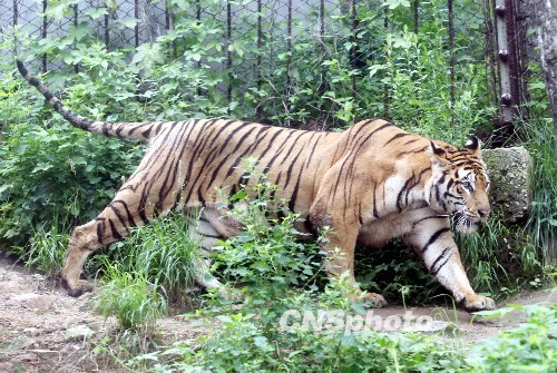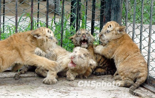 7月20日,在濟南野生動物世界,剛出生2個月的四胞胎小老虎首次走出產(chǎn)房與游客見面。據(jù)了解,該景區(qū)飼養(yǎng)的孟加拉虎“虎妞”于5月10日產(chǎn)下四胞胎,其中兩只是金虎,一只雪虎,一只孟加拉虎,專家介紹,一胎產(chǎn)下3個品種的虎崽,在國內(nèi)還是首次出現(xiàn)。另據(jù)了解,虎有3種基因的顏色,黑色、黃色和白色,其中黑色與黃色是顯性基因,白色為隱性基因,當黃色基因不能表達時,被白色基因掩蓋,就生出白虎,黑色與黃色基因都沒有表達時,白色基因就成為顯性基因,就生出雪虎,當白色與黑色基因變成隱性基因時,就會生出金黃色的虎,也稱為“金虎”。中新社發(fā) 龔輝 攝