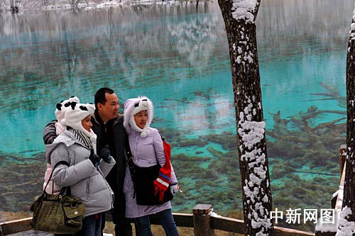 16日,一夜大雪給九寨溝的長海、五彩池、天鵝海、五花海等都披上了冬裝,山下湛藍(lán)的海子,山腳繽紛的紅葉,山上多姿的霧松,讓游客飽覽無余。在海拔較高的長海、箭竹海等景點(diǎn),堆起了近10厘米厚的雪,游人們興奮地打雪仗、堆雪人,和雪人合影留念。目前,九寨溝旅游進(jìn)入了淡季。從11月16日開始執(zhí)行的淡季門票價(jià)(80元/人),也讓旅游者感到驚喜。蘇杰 攝