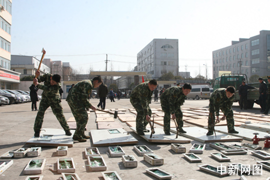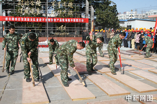 中新網(wǎng)連云港3月10日電 (蘇欣 吳茂新 朱曉穎)10日上午,在連云港市消防支隊營區(qū)院內(nèi),由消防部門聯(lián)合工商、質(zhì)監(jiān)共同查獲的不合格滅火器、消火栓、消防應急照明燈等520余件消防假冒偽劣產(chǎn)品被集中銷毀。