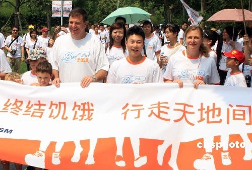 6月7日,由聯(lián)合國(guó)世界糧食計(jì)劃署(WFP)、中國(guó)扶貧基金會(huì)、WFP主要企業(yè)合作伙伴共同舉辦的2009“終結(jié)饑餓——行走天地間”全球慈善義走活動(dòng)(中國(guó)站)在上海舉行。奧運(yùn)冠軍李小鵬(中)應(yīng)邀出席并親身參與了慈善義走活動(dòng),呼吁人們共同抗擊全球范圍內(nèi)的兒童饑餓和營(yíng)養(yǎng)不良問題。中新社發(fā) 湯彥俊 攝