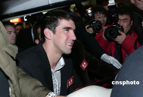 1月10日,在2008北京奧運(yùn)會(huì)上奪得8枚金牌的美國(guó)游泳選手菲爾普斯(michael phelps),抵達(dá)北京首都國(guó)際機(jī)場(chǎng)。此次他將為一家汽車(chē)廠商進(jìn)行代言活動(dòng),并拍攝宣傳片,工作之余,他還將到自己創(chuàng)造輝煌的國(guó)家游泳中心“水立方”參觀。中新社發(fā) 杜洋 攝