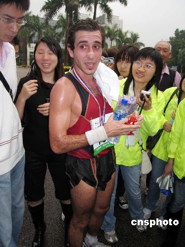 “九洲杯”珠海首屆半程馬拉松邀請(qǐng)賽于二十二日早上八點(diǎn)鳴槍起跑,該項(xiàng)賽事吸引了境內(nèi)外兩千名長(zhǎng)跑愛(ài)好者參加。經(jīng)過(guò)一番角逐,本次半程馬拉松賽的男子總冠軍由亞洲半程馬拉松紀(jì)錄保持者、香港選手史提芬奴贏得,女子總冠軍則由十六歲的中國(guó)籍女孩楊麗文奪得。圖為史提芬奴在結(jié)束比賽后接受記者的訪(fǎng)問(wèn)。中新社發(fā) 鄧媛雯 攝