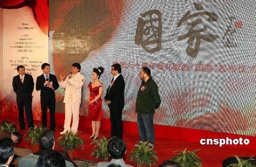 2月28日,國慶60周年獻禮歌曲《國家》在北京人民大會堂舉行發(fā)布儀式。海內(nèi)外華人音樂者全情投入,協(xié)力打造成為這首主旋律歌曲的一大亮點。中國移動將利用無線音樂平臺對其進行全程推廣,使這首歌跨越空間的阻隔,向全球華人傳遞信心與力量。國際巨星成龍專程從云南拍片現(xiàn)場趕來參加歌曲發(fā)布儀式。現(xiàn)場通過視頻播放鋼琴巨星郎朗從紐約錄制傳來的創(chuàng)作感言。作曲家金培達、音樂制作人余秉翰來自香港。參加發(fā)布儀式的還有來自北京的總策劃之一、詞作者王平久和演唱者劉媛媛。中新社發(fā) 杜洋 攝