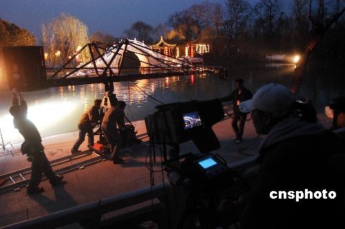 3月9日,新版《紅樓夢(mèng)》劇組人員在揚(yáng)州瘦西湖“熙春臺(tái)”景區(qū)進(jìn)行試拍。當(dāng)日,由李少紅執(zhí)導(dǎo)的新版電視連續(xù)劇《紅樓夢(mèng)》在揚(yáng)州瘦西湖景區(qū)取景。中新社發(fā) 范友林 攝