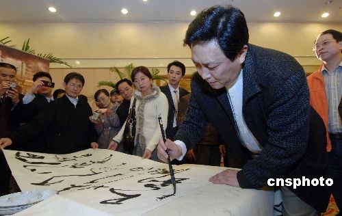 三月二十四日,在電視連續(xù)劇《鄭和下西洋》中飾演明成祖朱棣的著名演員唐國強在福州舉行的該劇開播儀式上現(xiàn)場揮毫題字。該劇是為紀(jì)念鄭和下西洋600周年特別拍攝的,由福建省委宣傳部、中央電視臺文藝中心影視部及長樂市委、市政府等單位聯(lián)合出品!多嵑拖挛餮蟆肥吩姲愕孛枋隽肃嵑吐暑I(lǐng)船隊七下西洋,歷時二十九年,成功開辟海上絲綢之路的壯舉,展現(xiàn)了鄭和七次下西洋在政治、經(jīng)濟、文化、外交、科技等領(lǐng)域取得的輝煌成就。中新社發(fā) 劉可耕 攝