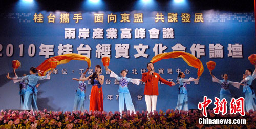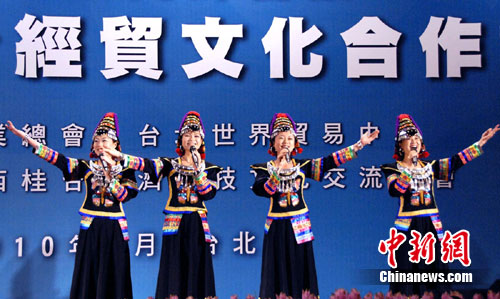 中新網(wǎng)臺(tái)北7月4日電(廖祖平)中共廣西壯族自治區(qū)委員會(huì)書(shū)記郭聲琨率領(lǐng)1000余人的廣西經(jīng)貿(mào)文化代表團(tuán)7月1日—7月5日在臺(tái)灣參訪,這是海峽兩岸經(jīng)濟(jì)合作框架協(xié)議(ECFA)簽署后大陸第一個(gè)赴臺(tái)的經(jīng)貿(mào)文化代表團(tuán)?图胰司劬拥膹V西賀州市也由市委書(shū)記彭曉春率賀州代表團(tuán)隨廣西團(tuán)一起赴臺(tái)。7月3日下午,由桂臺(tái)(賀州)客家文化旅游合作示范區(qū)與臺(tái)灣世界客屬總會(huì)、廣西同鄉(xiāng)會(huì)聯(lián)合主辦的桂臺(tái)(賀州)客家文化旅游經(jīng)貿(mào)合作懇談會(huì)在臺(tái)北舉行。