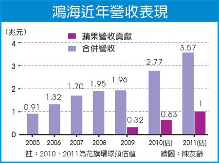 張凱偉更預(yù)估,蘋果占鴻海營(yíng)收貢獻(xiàn),將從2009年的3200億元成長(zhǎng)至2010年的6300億元,2011年則上看1兆元,因此,除非競(jìng)爭(zhēng)對(duì)手能將生產(chǎn)蘋果產(chǎn)品的員工人數(shù)拉高3倍,否則將難以撼動(dòng)鴻海的主導(dǎo)地位。