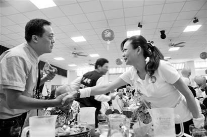 給記者記憶深刻的是,一直在我們身邊默默坐著的一對盛裝夫婦,他們?nèi)胱缶湍,吃了兩三樣菜后,突然聽到司儀說:“請郭添財?shù)娜!蔽疑磉叺钠炫叟繋е⑿,款款走上舞臺,拿起話筒開始說著洋洋灑灑的祝福語,然后話鋒一轉(zhuǎn):請給專業(yè)、認真、負責的郭添財博士一個機會,給我們支持,好不好!我這才反應(yīng)過來,身邊這對夫婦竟然是大臺南市長候選人郭添財?shù)娜缛。郭家三嫂講完后,回到我們這一圓桌,舉杯和我們喝了口酒,然后從包里拿出郭添財?shù)拿纸o同桌的人,名片上包括郭添財?shù)膫人照片、從政簡介、競選口號和各種聯(lián)絡(luò)方式。分完名片,說完拜托的話,他們就站起來說:“我們要先走了,還要去趕下一場!