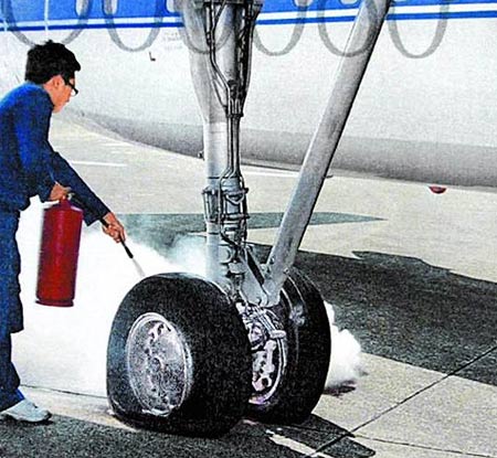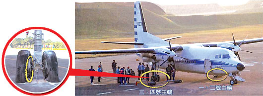 2009/11/01 FK-5003執(zhí)行馬英九座機(jī)任務(wù),在臺中清泉崗基地落地后滑行,右主輪煞車盤過熱,導(dǎo)致來令片及輪胎損傷熱熔并冒煙起火。