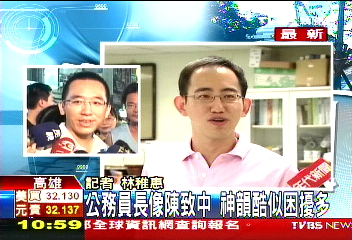 中新網(wǎng)7月26日電 據(jù)臺灣TVBS電視臺報道,陳致中卷入召妓疑云,也讓另外一個人有點困擾,那就是高雄市政府社會局的課員張福仁;跟陳致中同年齡,身高比陳致中高一點,兩個人乍看之下還真的有點像,走在路上,偶爾會被人說長的像,雖然不反感,但神似陳致中,在這敏感時期還真是有點尷尬。