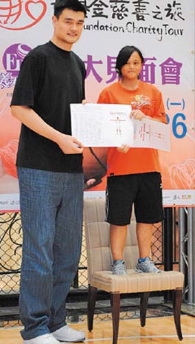 “哇!好高,真的是巨人!”身高只到姚明腰部的桃源中學(xué)一年級(jí)女學(xué)生杜儷馨,代表上臺(tái)致贈(zèng)卡片時(shí),特地搬了張椅子墊高,畫面很有趣。