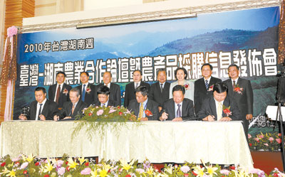 8月6日上午,在臺南走馬瀨農(nóng)場舉行了“臺灣-湖南農(nóng)業(yè)合作論壇暨農(nóng)產(chǎn)品采購信息發(fā)布會”。湘臺農(nóng)業(yè)界人士200余人參加了洽談會。臺灣海峽兩岸農(nóng)業(yè)協(xié)會與湖南省農(nóng)業(yè)產(chǎn)業(yè)協(xié)會簽訂了“湘臺農(nóng)業(yè)合作備忘錄”;湘臺相關(guān)企業(yè)簽訂了“臺灣茶葉采購意向書”、“臺灣水產(chǎn)品、水果等農(nóng)產(chǎn)品采購合作意向書”、“臺灣食品采購合同”、在湖南各大超市設(shè)立“苗栗縣卓蘭鎮(zhèn)水果專柜”合作意向;湖南省供銷合作社發(fā)布了農(nóng)產(chǎn)品采購信息。兩地農(nóng)業(yè)界表示將攜手合作,取長補(bǔ)短,推動兩地農(nóng)業(yè)共同發(fā)展。