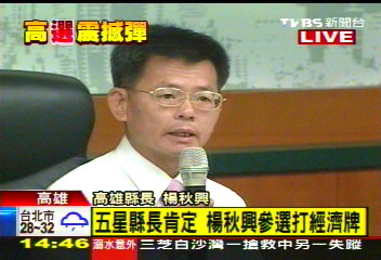 中新網(wǎng)8月9日電 據(jù)臺灣TVBS報道,高雄縣長楊秋興9日下午在縣府舉行記者會,正式宣布參選大高雄市長選舉,并對外體說明決定和參選的心路歷程。
