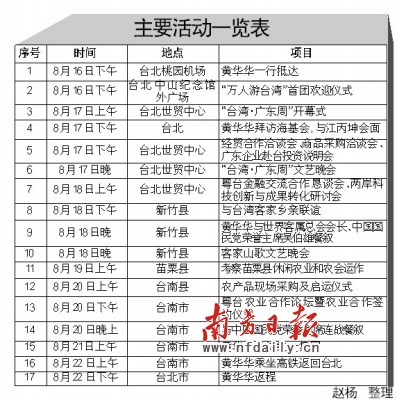 ●2010年8月16日,廣東省省長黃華華帶隊赴臺灣舉行“臺灣·廣東周”活動;顒又黝}為“合作之旅、鄉(xiāng)情之旅”,內容包括經貿合作、商品采購、旅游合作、農業(yè)合作、文化交流、宣傳亞運等,當日還將舉行“萬人游臺灣”首團啟動儀式。 (記者 陶達嬪 鄧紅輝)