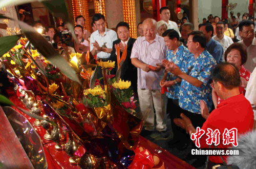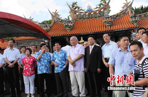 中新網(wǎng)新竹8月18日電(記者 張傳熙)率領(lǐng)廣東省經(jīng)貿(mào)文化交流團(tuán)訪臺的黃華華省長今天下午從臺北抵達(dá)新竹縣展開尋親、訪友的“鄉(xiāng)情之旅”。下午,在新竹縣領(lǐng)導(dǎo)人邱鏡淳及眾多鄉(xiāng)親的陪同下,黃華華到當(dāng)?shù)卮砜图椅幕牧x民廟行禮、祭拜。