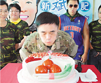 據(jù)報(bào)道,郝龍斌22日換上迷彩服與網(wǎng)友粉絲PK漆彈對(duì)戰(zhàn),同時(shí)也度過(guò)58歲生日;粉絲團(tuán)特別安排了兩位女兵,送上“蔥滿(mǎn)勝蒜”蛋糕,象征市長(zhǎng)選舉“充滿(mǎn)勝算”。郝龍斌開(kāi)心許下三個(gè)愿望:第一是風(fēng)調(diào)雨順,第二是希望花博圓滿(mǎn)成功,第三個(gè)愿望,“大家都知道,所以不說(shuō)了!(應(yīng)指連任成功)”