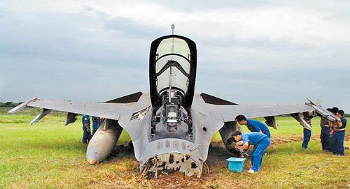 當(dāng)年6月26日機(jī)號(hào)6812的F-16B型雙座機(jī),由嘉義聯(lián)隊(duì)莊姓分隊(duì)長(zhǎng)駕駛,后座載著“國防部”整評(píng)室副主任陳姓少將,進(jìn)行戰(zhàn)術(shù)攔截課目的熟飛,降落時(shí),未注意跑道積水,致使戰(zhàn)機(jī)落地時(shí),飛行員施放阻力傘后戰(zhàn)機(jī)嚴(yán)重右偏,雖然隨即拋棄阻力傘,立即使用方向舵及煞車改正偏右狀況仍無效,戰(zhàn)機(jī)降落跑道上行進(jìn)約一公里后沖向草坪,機(jī)身嚴(yán)重受損;經(jīng)評(píng)估修復(fù)戰(zhàn)機(jī),不包括發(fā)動(dòng)機(jī)的修復(fù)即要花800多萬元新臺(tái)幣。