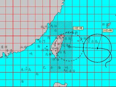 臺(tái)風(fēng)“凡那比”17日清晨距離花蓮東方約490公里,以每小時(shí)15公里轉(zhuǎn)18公里速度,向西行進(jìn),7級(jí)風(fēng)暴風(fēng)半徑200公里,近中心最大風(fēng)速每秒43 米。