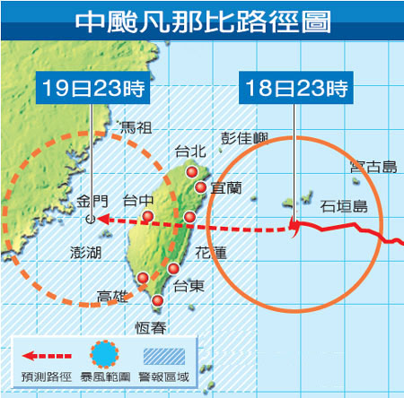 據(jù)報(bào)道,臺(tái)氣象部門表示,“凡那比”臺(tái)風(fēng)19日凌晨5時(shí)中心位置在花蓮東方100公里海面上,以每小時(shí)20 公里速度向西行進(jìn),7級(jí)風(fēng)暴風(fēng)半徑200公里,中心平均風(fēng)速由每秒43米增為45米,距強(qiáng)烈臺(tái)風(fēng)下限每秒51米不遠(yuǎn),其暴風(fēng)圈已籠罩中部以北、東北部及東部陸地,各地都有強(qiáng)風(fēng)暴雨,但宜蘭、花蓮應(yīng)特別警戒。