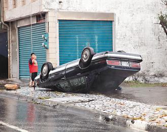 中新網9月20日電 據臺灣《聯合報》報道,臺風“凡那比”(大陸稱“凡亞比”)強勁,花蓮刮起17級強風,一整排十多輛轎車車窗被吹裂“開花”,轎車四腳朝天,摩托車騎士閃躲滿天飛舞的招牌鐵片,有民眾以“血滴子”來形容它的恐怖。