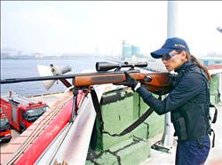 臺南市警察局相關單位昨在安平港演練船只遭外籍歹徒劫持勒索,從陸海空全面包抄合作救人,過程逼真。鄭蓮玉經(jīng)特殊任務警力訓練合格,在反劫船任務演練中擔任狙擊手,持狙擊槍在頂樓瞄準歹徒,準備隨時配合行動射擊,架式十足。