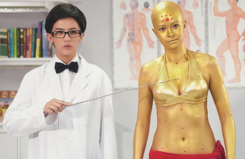 以勁爆光頭造型示人的柯念萱,為了這個(gè)造型就花了2個(gè)多小時(shí)打扮,穿上武裝片中的頭套后,還要仔細(xì)的漆上金漆,不時(shí)提心吊膽擔(dān)心油漆刷到臉上?履钶婷撓乱路,才驚覺百密總有一疏,“身上有些地方都沾到金漆了啦!要洗好久!”翁子麒戴假發(fā)也是忍著悶熱拍攝。