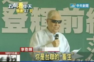 中新網(wǎng)10月12日電 據(jù)臺灣“今日新聞網(wǎng)”報道,“你是臺聯(lián)(‘臺聯(lián)黨’)的‘畜生’!”李登輝11日在替民進黨新北市長參選人蔡英文站臺時出現(xiàn)口誤;蛟S是真的年紀(jì)大了,李登輝這次替蔡英文助陣,不但講到激動處時,手抖個不停,還口誤連連,讓坐在一旁的蔡英文只能尷尬地笑。
