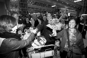 昨晚,首批被困北京游客抵京。20時(shí)剛過,游客紛紛走下飛機(jī),多為白發(fā)老人。在接機(jī)口,神舟國(guó)旅工作人員將鮮花送到老人手上,老人們表示感謝,“我們命大,感謝大家關(guān)心!