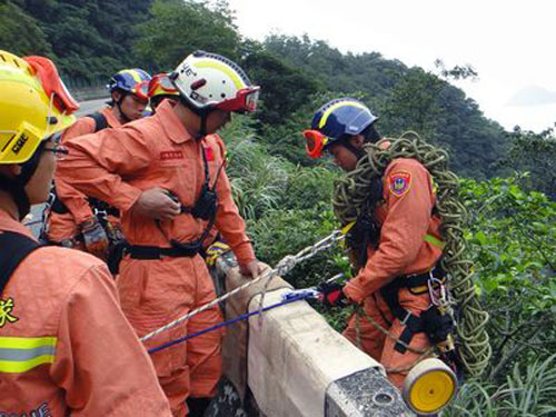 歷經(jīng)40分鐘路程,來(lái)到116公里處,前方已一大片塌方,無(wú)法再向前。不到片刻,一群身穿橘衣、步伐整齊的臺(tái)北市搜救隊(duì)朝這走來(lái)。在短暫的集合、下達(dá)指令后,搜救隊(duì)員系著繩索,一個(gè)接著一個(gè)從路邊護(hù)欄緩緩垂降,搜索生還者及車輛殘骸。