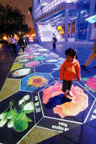 投影光雕有五個互動設計,測試階段只展演“花語寄情”,一踩在投影花苞上,玫瑰、向日葵、茶花、梅花等花卉就會瞬間盛開,還會出現(xiàn)花卉信息,朵朵投影互動花海,恰與一旁地景花!罢婊ā毙纬捎腥Ρ。
