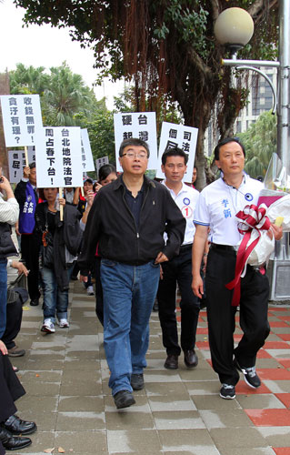 中新網(wǎng)11月9日電 據(jù)臺灣《聯(lián)合報》報道,國民黨“立委”邱毅及臺北市議員李新等人,8日率近百人到臺北地方法院丟雞蛋抗議,同時按鈴告發(fā)審判長周占春枉法裁判,由臺北地檢署受理。